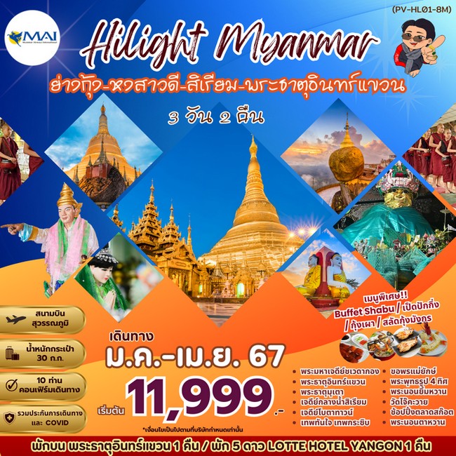 HILIGHT MYANMAR BY 8M ย่างกุ้ง หงสาวดี พระธาตุอินทร์แขวน สิเรียม 3วัน 2คืน