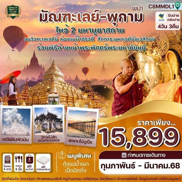- วันที่ 3 มัณฑะเลย์-พิธีล้างพระพักตร์พระมหามัยมุนี – วัดกุโสดอว์-พระราชวังไม้สักทอง-สนามบินมัณฑะเลย์-สนามบินดอนเมือง