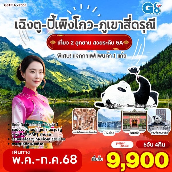 โดยสายการบิน Thai VietJet Air (VZ) เที่ยวชม 2 อุทยานระดับ 5A อุทยานปี้เผิงโกว และอุทยานสี่ดรุณี เส้นทางหุบเขาซวงเฉียวโกว – จตุรัสหยางเทียนหวู่ – ถ่ายรูปคู่หมีแพนด้านอนเซลฟี่, หมีแพนด้าปีนตึกIFS – ร้านหนังสือจองซูเก๋อ – ชมไฟน้ำพุไม้ไผ่ ตึกSKP – วัดต้าฉือ – ช้อปปิ้งจุใจ ถนนไท่กู๋หลี, ถนนซุนซีลู่ – แวะจุ่ม POP MART สุดน่ารัก